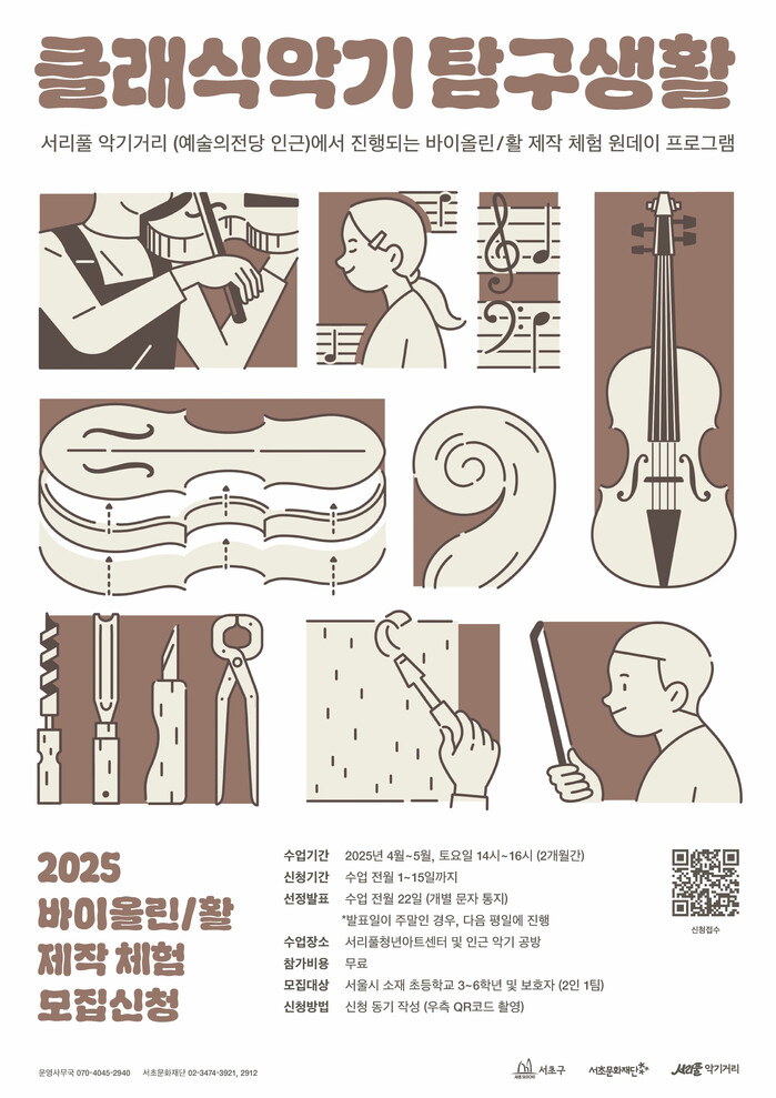 [시민일보 = 박소진 기자] 서울 서초구(구청장 전성수)와 서초문화재단이 초등학생을 대상으로 클래식 악기 제작을 체험하는 ‘2025 클래식악기 탐구생활’을 운영한다고 11일 밝혔다.