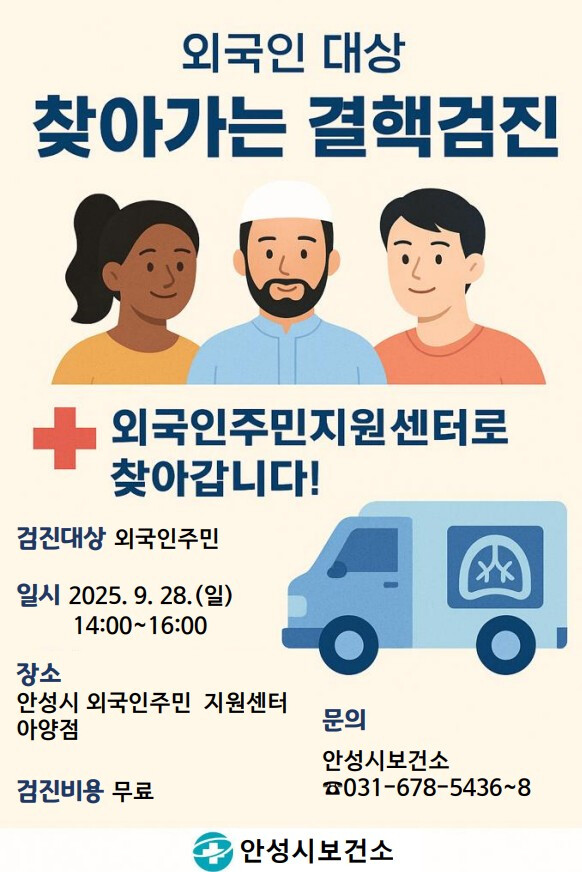 [안성=오왕석 기자] 안성시보건소는 의료접근성이 낮은 외국인 주민에게 결핵 검진의 기회를 제공하기 위해 2025년 9월 28일(일) 오후 2시부터 4시까지, 외국인주민지원센터(아양점)에서 ‘찾아가는 결핵 검진’을 무료로 실시한다고 밝혔다.