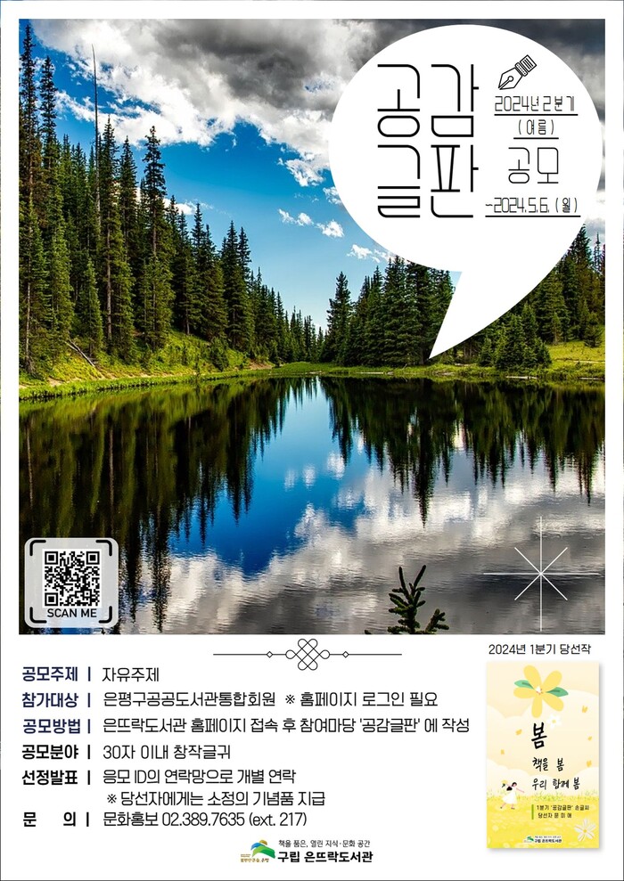 [시민일보 = 이대우 기자] 서울 은평구(구청장 김미경)는 구립 은뜨락도서관에서 2024년 2분기 ‘공감글판’ 글귀 공모를 시작한다고 밝혔다.