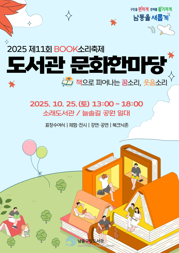 [인천=문찬식 기자] 인천 남동구립도서관이 오는 25일 소래도서관과 늘솔길공원에서 '제11회 도서관 문화한마당 BOOK소리 축제'를 개최한다고 23일 전했다.