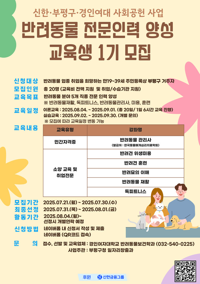 이 교육과정은 구가 신한은행 부평구청지점 및 경인여자대학교 반려동물보건학과와 협력하는 사회공헌사업으로, 취업과 연계된다.