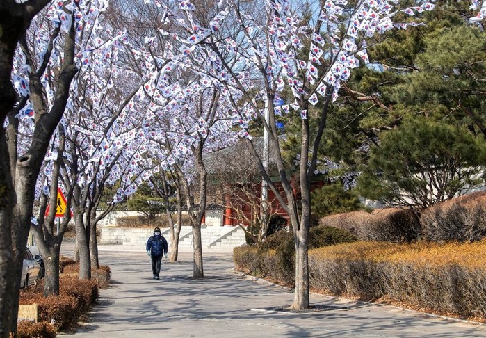 서울 용산구는 제103주년 3.1절을 맞아 지하철 6호선 효창공원앞역부터 효창공원 입구까지 510m 구간에는 가로등을 활용한 가로기 35조를 도로변을 따라 게양하고, 효창공원 입구 인근 200m 구간에는 태극기 트리 30그루를 조성했다. 사진은 효창공원 일대에 조성된 태극기 거리를 주민이 걷고 있는 모습. (사진제공=용산구청)