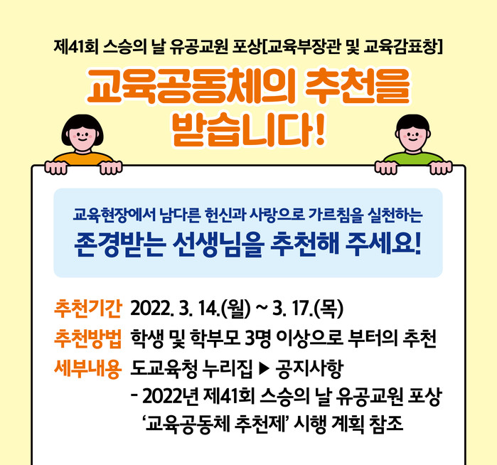 추천 기간은 3월 14일(월)부터 3월 17일(목)까지이다. 관련 내용은 도교육청과 각 기관 누리집에서 확인할 수 있다.