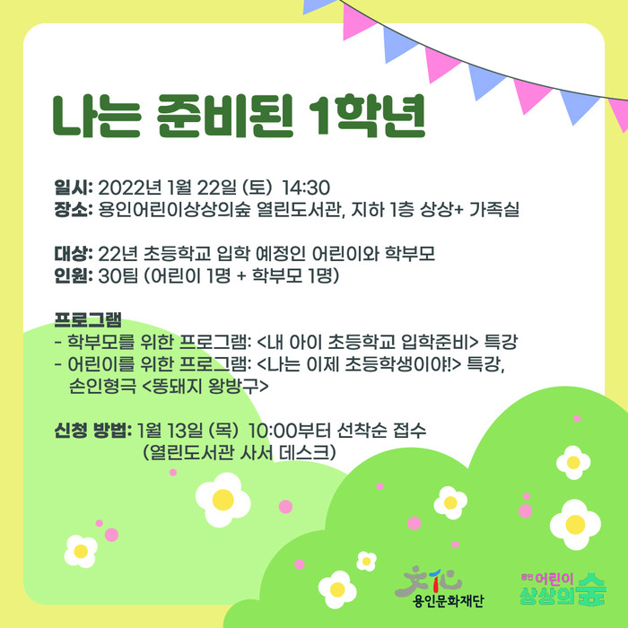[용인=오왕석 기자] (재)용인문화재단(이사장 백군기)은 용인어린이상상의숲(이하 상상의숲) 열린도서관에서 오는 22일 초등학교 입학을 준비하는 부모와 자녀를 대상으로 생애주기 맞춤형 도서문화콘텐츠 <나는 준비된 1학년>사업을 진행한다.