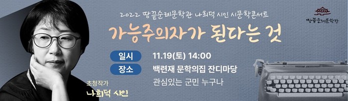 [해남=정찬남 기자] 시인 지망생들의 창작교과서로 불리는 나희덕 시인의 시문학 콘서트가 19일 오후 2시부터 전남 해남군 고산 윤선도 유적지내에 위치한 땅끝순례문학관 작가 레지던스 공간인 백련재 문학의 집 잔디마당에서 개최된다.