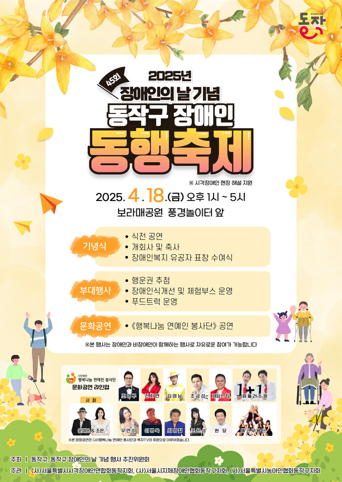[시민일보 = 여영준 기자] 서울 동작구(구청장 박일하)는 제45회 장애인의 날(4월20일)을 맞아 오는 18일 오후 1시 보라매공원 풍경놀이터 앞에서 ‘2025년 동작구 장애인 동행축제’를 개최한다고 밝혔다.
