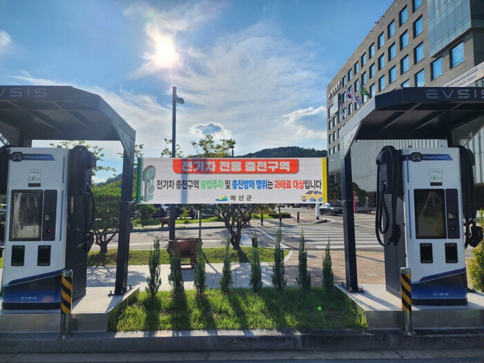 [예산=김의석 기자] 충남 예산군은 군청사 지상주차장(의회청사 전면 지상주차장)에 전기차 충전시설 5기를 새롭게 설치하고 9일부터 본격 운영에 들어갔다고 밝혔다.