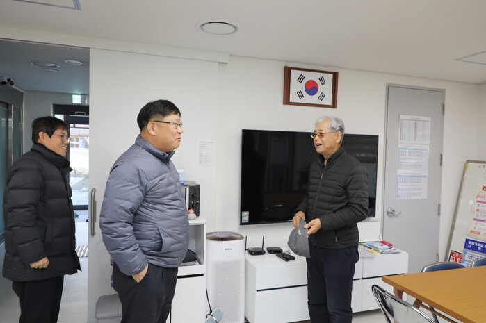 최근 이상균 경기 수원시 팔달구청장이 을사년 새해를 맞아 노인들의 안부를 확인하고 겨울철 난방 상태를 점검하기 위해 화서동에 위치한 꽃뫼경로당을 방문했다. 사진은 이 구청장(가운데)이 관계자와 이야기를 나누고 있는 모습 .(사진=팔달구청 제공)
