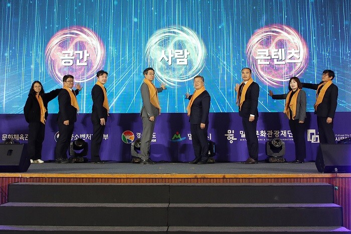 | ▲ 참석내빈들이 협력 세레머니를 하고 있다.(왼쪽부터 박은진 밀양소통협력센터장, 강은구 지방시대위원회 지방산업정책과장, 임철언 행정안전부 균형발전지원국장, 유병채 문화체육관광부 문화예술정책실장, 박일호 밀양시장, 정정규 밀양시의회 의장, 한미영 경남도 문화예술과장, 장병수 밀양시문화도시센터장) |