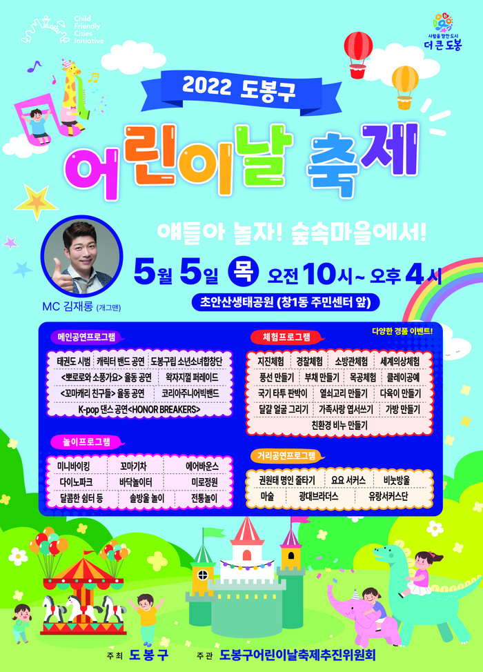 [시민일보 = 박준우 기자] 서울 도봉구(구청장 이동진)가 제100회 어린이날을 맞아 '2022 도봉구 어린이날 축제, 얘들아 놀자! 숲속마을에서!'를 개최한다고 25일 밝혔다.