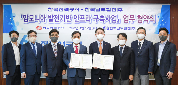 | ▲ 협약 후 (왼쪽에서 네번째) 심재원 남부발전 사업본부장, (왼쪽에서 다섯번째) 최현근 한전 전력혁신본부장이 기념촬영을 하고 있다. (사진제공=한전) |