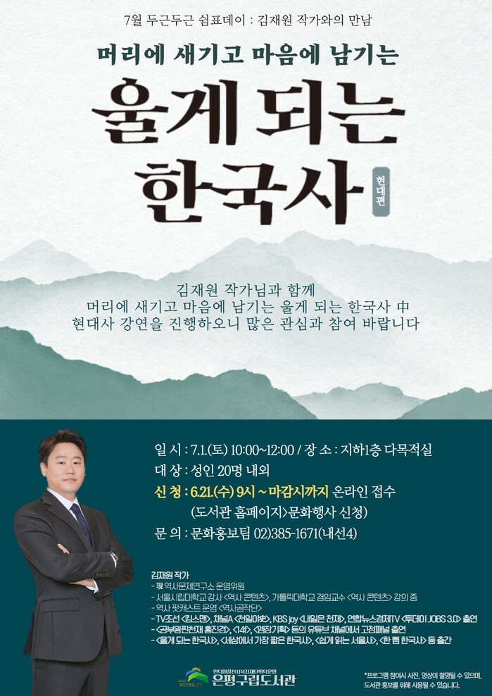 도서관 관계자는 “7월 두근두근 쉼표데이를 맞아 김재원 작가를 초청하여 흥미로운 역사 이야기를 준비하였다. 이번 강연을 통해 쉽고 재미있게 역사 지식을 얻고 더 나아가 역사를 기반으로 미래를 대비할 수 있는 자리가 되길 바라며, 지역 주민들의 많은 관심과 참여를 부탁드린다.”라고 전했다.