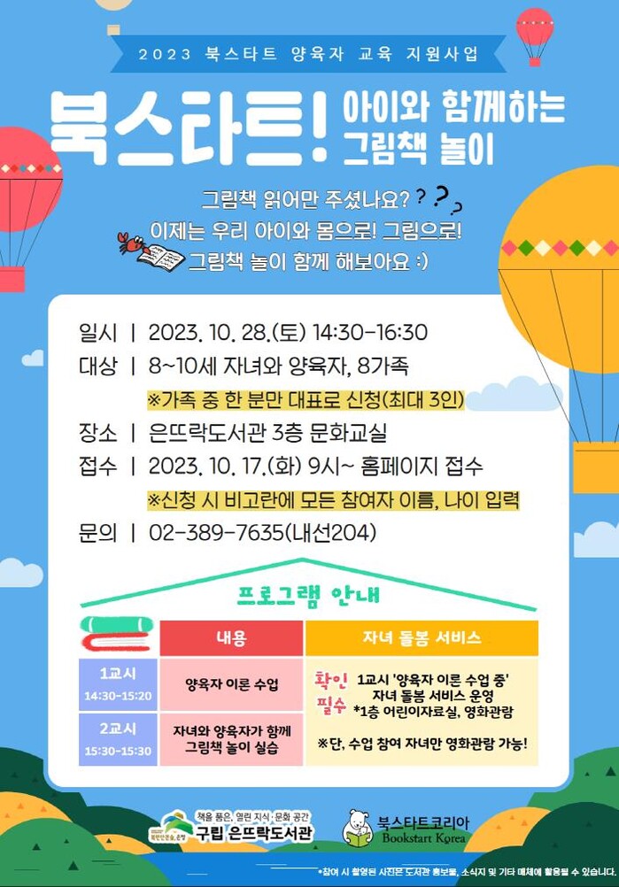 신청은 지역내 자녀를 둔 양육자 누구나 가능하며, 구립 은뜨락도서관 홈페이지에서 선착순으로 접수하면 된다.
