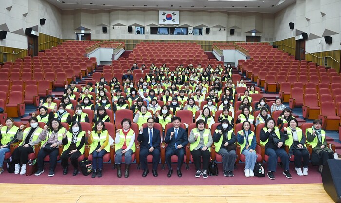경기 부천시가 최근 시청 어울마당에서 ‘2025년 어린이통학안전사업(워킹스쿨버스)’에 참여하는 안전교육지도사를 대상으로 안전교육을 실시하고, 근로계약서 작성 및 물품 배부를 마친 후 발대식을 개최했다. 사진은 발대식에서 조용익 시장(앞줄 왼쪽 여덟 번째)이 안전교육지도사들과 기념 촬영을 하는 모습. (사진=부천시청 제공)