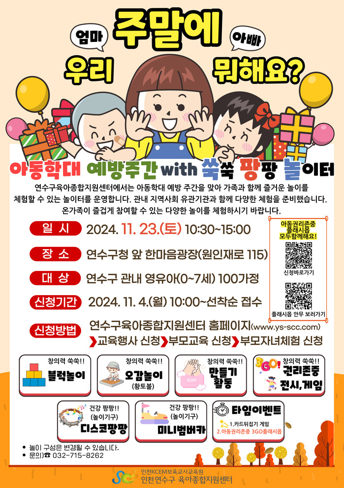 또 23일에는 구청 한마음 광장에서 ‘쑥쑥팡팡 놀이터’가 들어서는데, 이 행사에서는 가족센터, 연수종합사회복지관, 선학종합사회복지관, 어린이집이 함께 다양한 놀이와 체험 부스를 운영한다.
