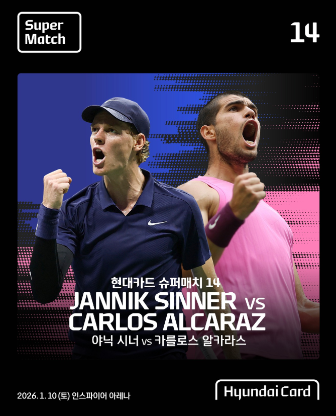 내년 1월10일 인천 인스파이어리조트 아레나에서 열리는 이번 ‘현대카드 슈퍼매치 14 야닉 시너 VS 카를로스 알카라스’는 세계 남자 테니스 랭킹 1·2위의 만남이자, 글로벌 최초로 양 선수의 단독 이벤트 경기다.
