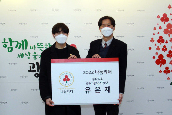 광주사회복지공동모금회가 광주고등학교 2학년에 재학 중인 유은재군이 최연소 나눔리더로 가입했다고 밝혔다. 사진은 유은재 학생이 장학금을 기부하고 관계자와 기념촬영을 하는 모습.