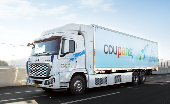 쿠팡은 새해부터 로켓배송을 위한 배송시설 간 운송에 ‘친환경 수소화물차(11t)’를 도입해 시범 운영한다고 23일 밝혔다.