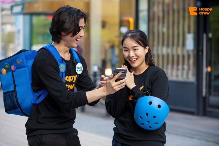 지난해 4월 초 론칭한 ‘해피크루(Happy Crew)’는 ‘행복(Happy)을 전하는 사람들(Crew)’이라는 의미로 만 19세 이상이면 누구나 도보 배달에 참여할 수 있는 서비스 플랫폼이다. 가장 근거리에 있는 배달원에게 주문을 자동 매칭해주는 AI 배차 시스템을 활용해 효율·정확성이 높고, 게임처럼 즐길 수 있는 다양한 콘텐츠를 함께 제공해 재미 요소를 더한 점이 특징이다.