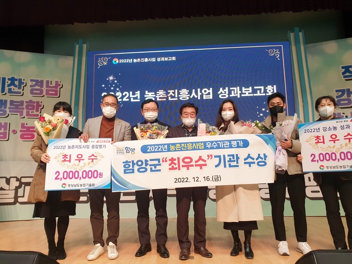 함양군은 이번 최우수농업기술센터 수상 외에도 농림축산식품부로부터 친환경농자재 우수시군으로 선정되어 우수상을 수상하는 등 다양한 농업분야 수상을 통해 어느 해보다 풍성한 한해를 마무리 하고 있다.