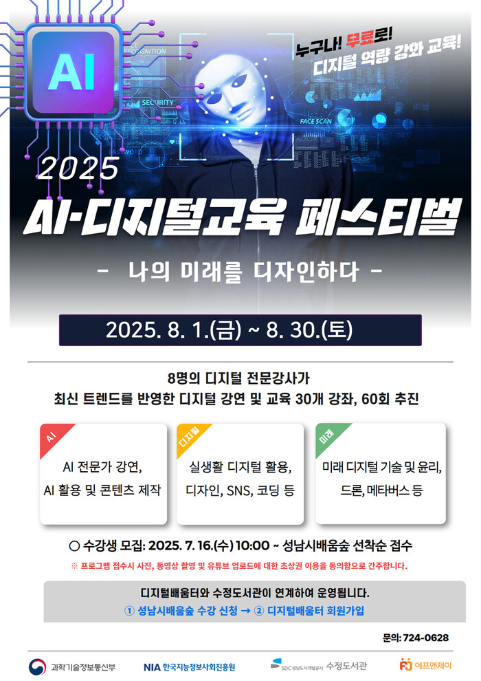 [성남=오왕석 기자] 성남도시개발공사(사장 이희석) 수정도서관은 오는 8월 1일부터 30일까지 시민들의 디지털 역량 강화를 위한 ‘제2회 AI·디지털 교육 페스티벌’을 개최한다고 16일 밝혔다.