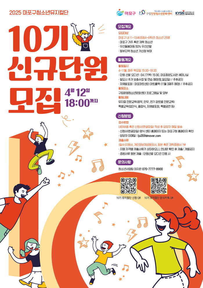 [시민일보 = 문민호 기자] 서울 마포구(구청장 박강수)는 ‘마포구 청소년 뮤지컬단’ 10기 단원으로 활동할 청소년을 오는 4월12일까지 모집한다고 17일 밝혔다.