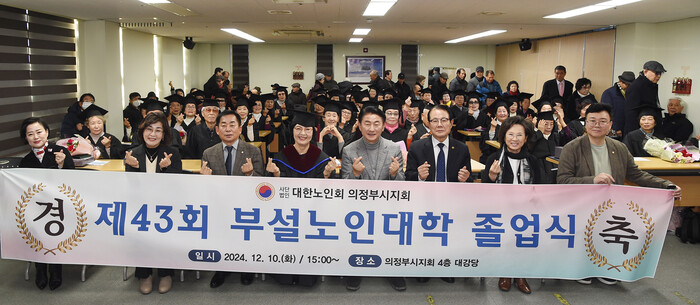 대한노인회 경기 의정부시지회가 최근 지회 4층 강당에서 ‘제43기 노인대학 졸업식’을 개최했다. 지난 4월 개강한 제43기 노인대학은 8개월 동안 노후관리, 한글 교육, 웃음치료, 건강관리, 문화탐방 등 다양한 프로그램을 진행하며 배움의 기회를 제공했다. 사진은 김동근 시장이 졸업생들과 함께 기념 촬영을 하는 모습. (사진=의정부시청 제공)