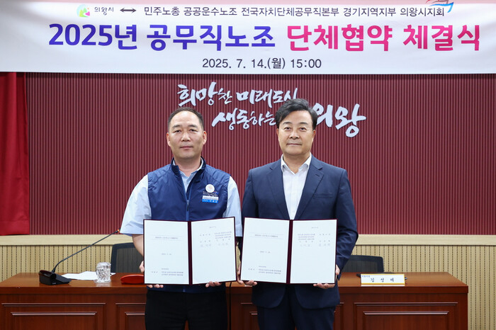 [의왕=송윤근 기자] 경기 의왕시가 공공운수노동조합 전국지방자치단체공무직본부 경기지역지부 의왕시지회와 14일 시청 중회의실에서 ‘2025년도 공무직 단체협약’을 체결했다고 밝혔다.