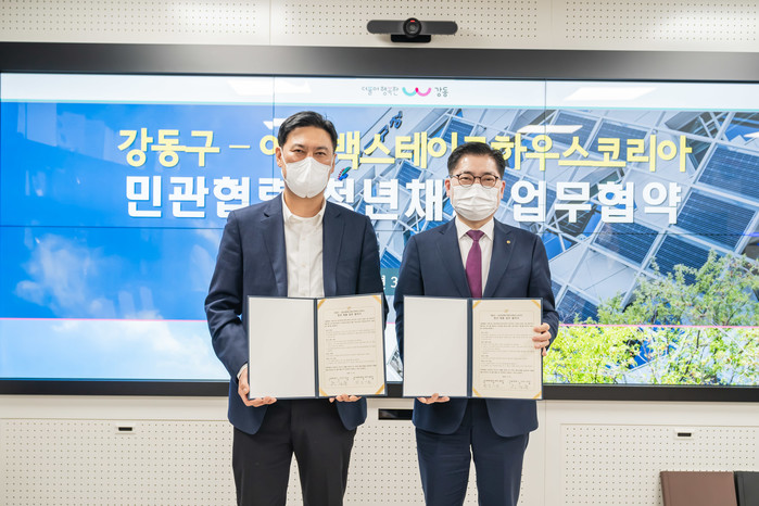 강동구는 지난 14일 (유)아웃백 스테이크하우스코리아와 업무협약을 체결했다. 협약으로 구는 구직자 모집 홍보 및 인재를 추천하고, 아웃백은 강동구 청년 구직자 채용을 진행하기로 합의했다. 사진은 협약식에서 이정훈 구청장(오른쪽)과 관계자가 기념촬영을 하는 모습. (사진제공=강동구청)
