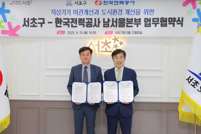 서울 서초구가 15일 구청에서 한국전력 남서울본부와 ‘지상기기 미관 개선과 도시환경 개선을 위한 업무협약’을 체결했다. 이번 협약은 두 기관이 상호 협력해 서초구 공공보도상 지상기기 정비를 통해 도시환경을 개선하고 쾌적한 보행환경을 만들기 위해 추진됐다. 사진은 전성수 구청장(오른쪽)이 협약서를 들고 기념 촬영을 하는 모습. (사진=서초구청 제공)