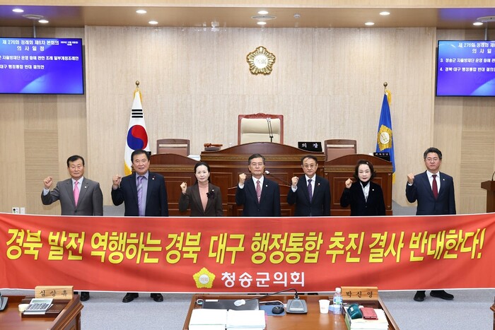 이에 청송군의회 의원들은 경북·대구 행정통합 반대 결의안을 만장일치로 의결하고, 주민의견 수렴 없는 일방적인 행정통합의 즉각 중단과 정부 차원의 지역 소멸 방지 방안 마련, 균형발전을 촉진할 실질적인 대책 마련을 촉구했다.