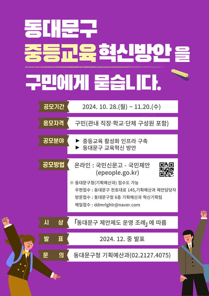 이필형 구청장은 “이번 공모전이 구민과 소통을 강화하고 동대문구 교육 혁신을 위한 정책을 발굴하는 기회가 되기를 희망한다”며 “우수한 제안이 정책에 반영될 수 있도록 학부모, 교사, 학생을 비롯한 구민 여러분의 많은 참여를 부탁드린다”고 말했다.