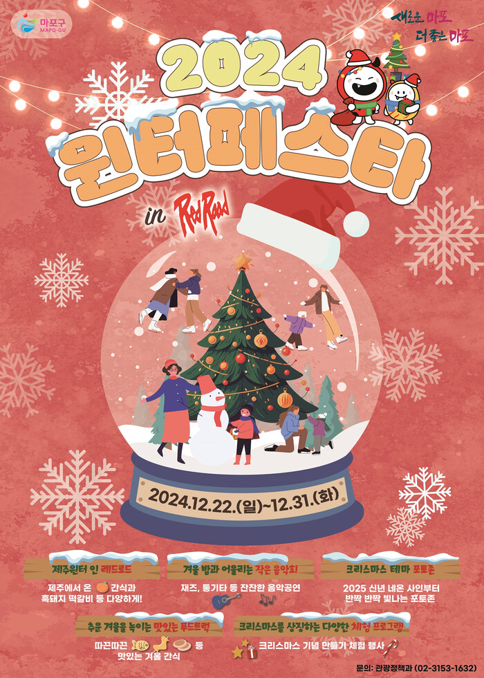 [시민일보 = 문민호 기자] 마포구(구청장 박강수)는 오는 31일까지 크리스마스와 연말을 더욱 따뜻하고 풍성하게 보낼 ‘윈터 페스타 인(in) 레드로드’를 진행하고 있다.