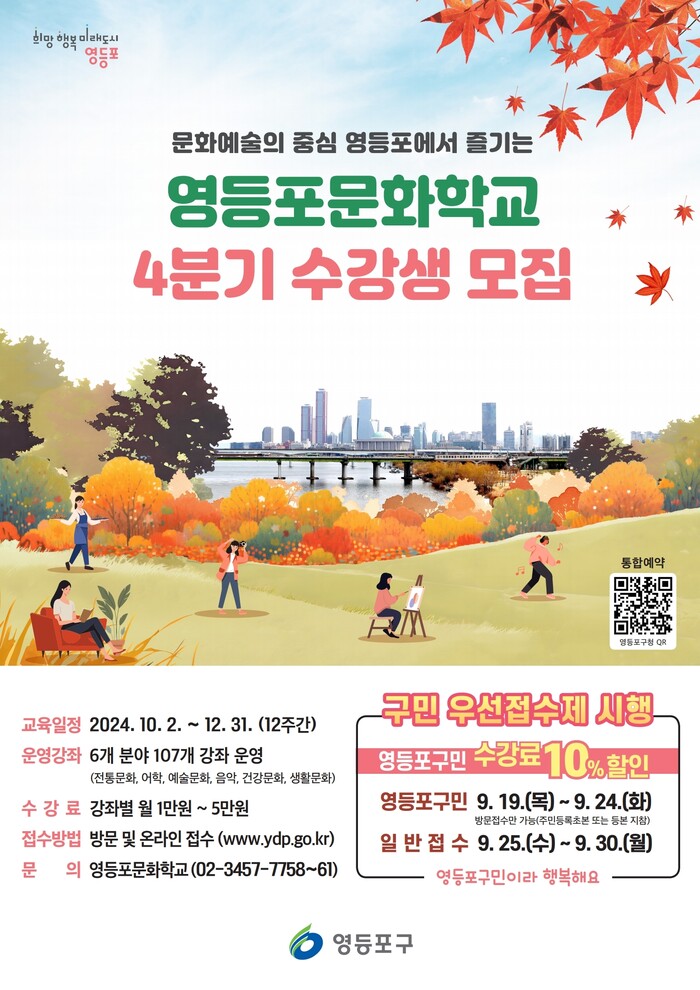 최호권 구청장은 “구민들의 문화 참여 기회와 접근성을 확대하기 위해 구민 및 직장인 우선 접수와 알찬 10% 할인 혜택을 마련했다”라며 ”앞으로도 구민들의 요구를 반영한 다양한 교육 프로그램을 제공해 영등포구가 문화와 배움의 중심지로 자리매김할 수 있도록 노력하겠다“라고 전했다.