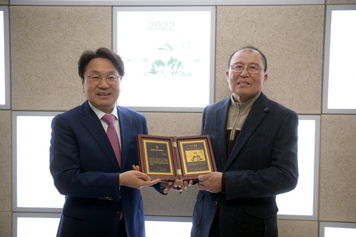 | ▲ 강기정 광주광역시장이 19일 오전 시청 접견실에서 김영춘 효사랑 나눔의 샘터 대표에게 광주광역시 명예의 전당 헌액 인증패를 수여한 후 기념촬영을 하고 있다. /광주광역시 제공 |
