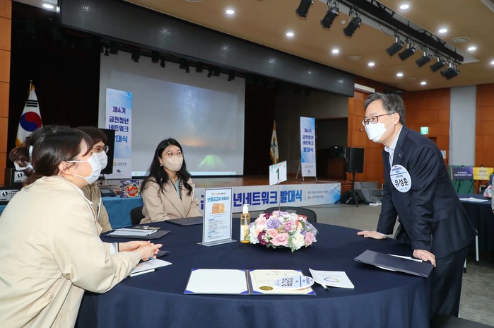 서울 금천구는 최근 금천의 미래를 이끌어나갈 열정 있는 청년들의 모임인 ‘제4기 금천청년네트워크’ 발대식을 개최했다. 발대식에서는 청년네트워크 위원 위촉장 수여와 분과별 관심 정책 등에 대한 의견을 나눴다. 사진은 유성훈 구청장(오른쪽)이 참가자들과 대화를 나누고 있는 모습. (사진제공=금천구청)