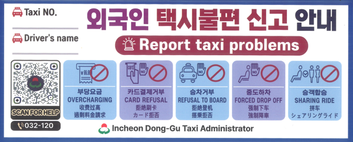 [인천=문찬식 기자] 인천 동구(구청장 김찬진)는 외국인 관광객을 대상으로 한 불법 택시 영업을 근절하고 이용 편의를 높이기 위해‘불편 신고 QR스티커’를 택시에 부착한다고 밝혔다.