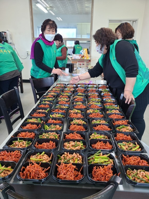 경기 포천시 가산면 새마을부녀회는 최근 포천시 릴레이 나눔봉사의 일환으로 지역내 홀몸노인에게 직접 만든 숙주나물·진미채볶음 등 밑반찬 46개 꾸러미와 쌀 10kg·23포대를 전달하는 ‘사랑의 밑반찬 나누기’ 행사를 진행했다. 사진은 이날 참여한 회원들이 반찬을 포장하고 있는 모습. (사진제공=포천시청)