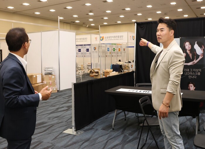 | ▲ 오언석 구청장(오른쪽)이 노상일 오렌지카운티 한인상공회의소 회장과 대회 현장을 둘러보고 있다. (사진=도봉구청 제공) |
