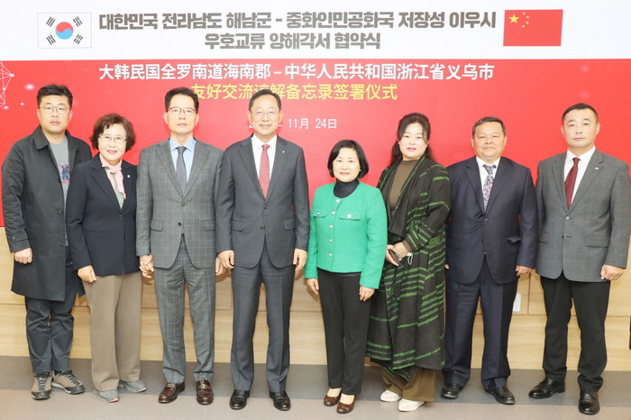 | ▲ 명현관 해남군수가 중국 이우시 예팡루이 이우시장, 장청강 주광주 총영사, 코트라 소익준 항저우무역관장, 신경숙 한중경제문화교육협회 이사장 등 관계자들과 해남군 이우시 우호협력 양해각서를 체결하고 기념촬영을 하고 있다. / 사진 = 해남군 제공 |
