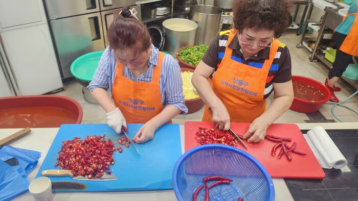 | ▲ 지난 4일, 왕십리도선동 지역사회보장협의체 위원들이 물김치를 만들고 있는 중이다. (사진=성동구청 제공) |