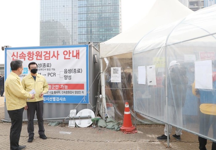 성장현 용산구청장이 최근 용산역·한남공영주차장 임시선별진료소, 구 종합행정타운내 마련된 재택·백신 통합 행정안내센터를 찾아 근무자들을 격려하고 애로사항을 듣었다. 사진은 성 구청장(오른쪽)이 용산역 임시선별진료소를 찾아 관계자의 설명을 듣고 있는 모습. (사진제공=용산구청)