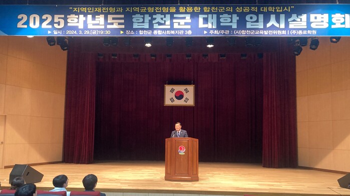 이번 입시설명회는 ㈜종로학원 주최로 정동완 강사(EBS 진로진학 대표강사)를 초빙해 ‘지역인재전형과 지역균형전형을 활용한 합천군의 성공적 대학입시’라는 주제로 2025학년 이후 경쟁력있는 대학입시를 위한 방법을 제시했다.