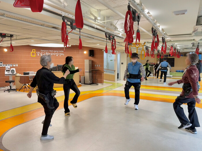 | ▲ 웨어러블 로봇을 착용하고 걷기 연습을 하는 구민들. (사진=강남구청 제공) |