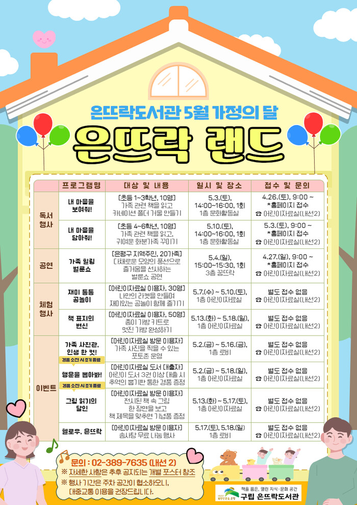 ‘은뜨락 랜드’는 가족이 소통하고 화합해 건강한 가족을 조성하는 데 도움을 주고자 마련됐다. 이번 행사는 내달 2일부터 18일까지 도서관 이용자와 지역 주민을 대상으로 공연, 체험행사, 독서 · 독후활동, 이벤트 등 다양한 프로그램을 운영할 예정이다.