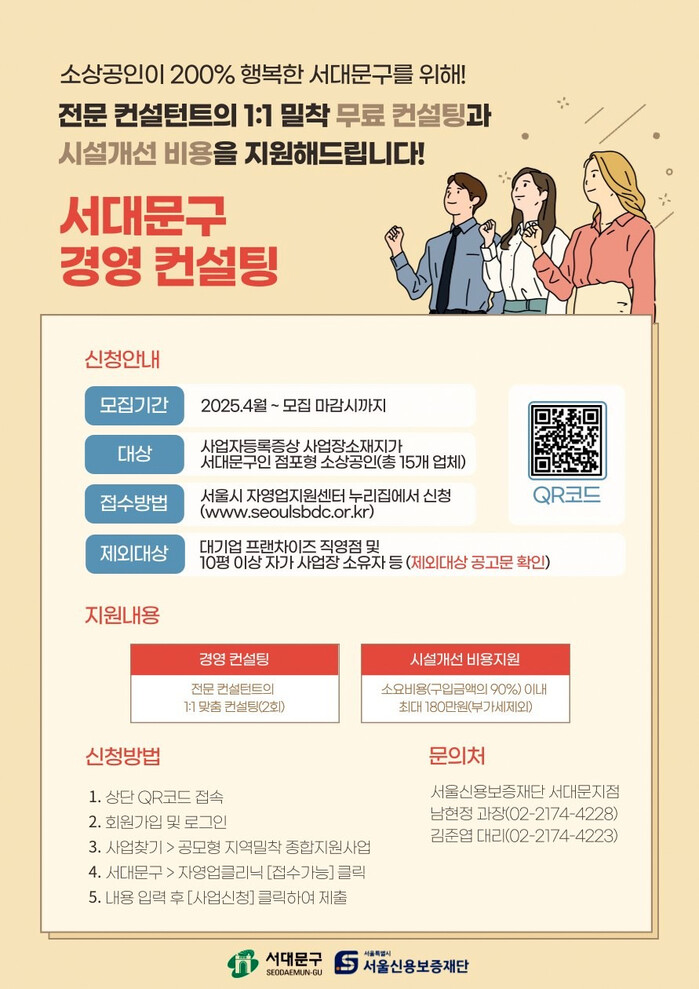 [시민일보 = 이대우 기자] 서대문구(구청장 이성헌)는 지역내 소상공인의 경영 안정과 경쟁력 강화를 위해 연말까지 ‘2025년 서대문구 소상공인 경영 컨설팅 지원사업’을 시행한다고 10일 밝혔다.