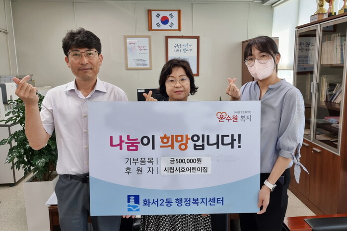 경기 수원시 팔달구 화서2동에 위치한 시립서호어린이집이 최근 직원들이 십시일반 모은 성금 50만원을 화서2동 행정복지센터에 기탁했다. 사진은 기탁 후 기념촬영을 하고 있는 어린이집 관계자들의 모습. (사진=팔달구청 제공)