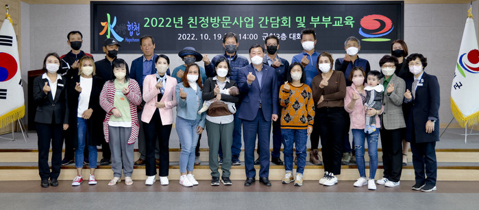 이 날 간담회에서는 사업 설명회와 친정방문 사업 추진을 위한 주의사항을 전달하였으며, 권윤숙 합천군육아종합지원센터장이 상호문화이해 및 부부소통을 주제로 부부간의 원활한 대화를 위한 소통방법 등 부부교육도 함께 진행하였다.