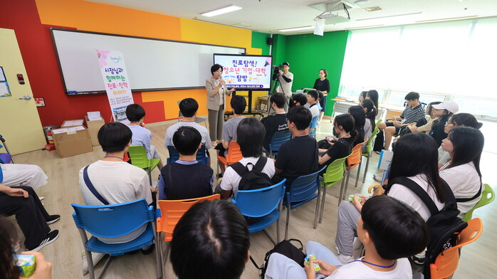 경기 과천시가 최근 지역내 중학교 2·3학년 및 고등학교 1학년 학생 25명을 대상으로 ‘진로탐색! 청소년 기업·대학 탐방’ 프로그램을 진행했다. 참가자들은 오전에 과천지식정보타운에 새롭게 입주한 에듀테크 기업 ‘비상교육’을 방문해 전시관 견학, 교과서 일일모델 체험, 현직자 질의응답 등 다양한 현장 체험 기회를 가졌다. 사진은 신계용 시장과 학생들이 진로 진학에 대해 이야기하고 있는 모습. (사진=과천시청 제공)