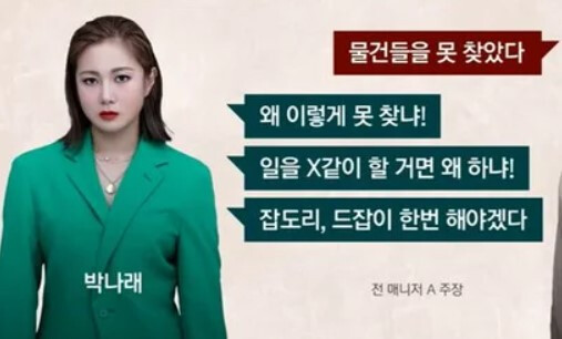 최근 JTBC 뉴스에서는 박나래의 막말과 관련한 내용을 방송해 진실 공방이 확산 중이다. 당시 박나래는 자신의 매니저에게 "일을 X같이 할 거면 왜 하냐!", "잡도리, 드잡이 한번 해야겠다" 등의 충격적인 발언을 쏟아낸 것으로 알려져 의혹이 증폭되고 있다.